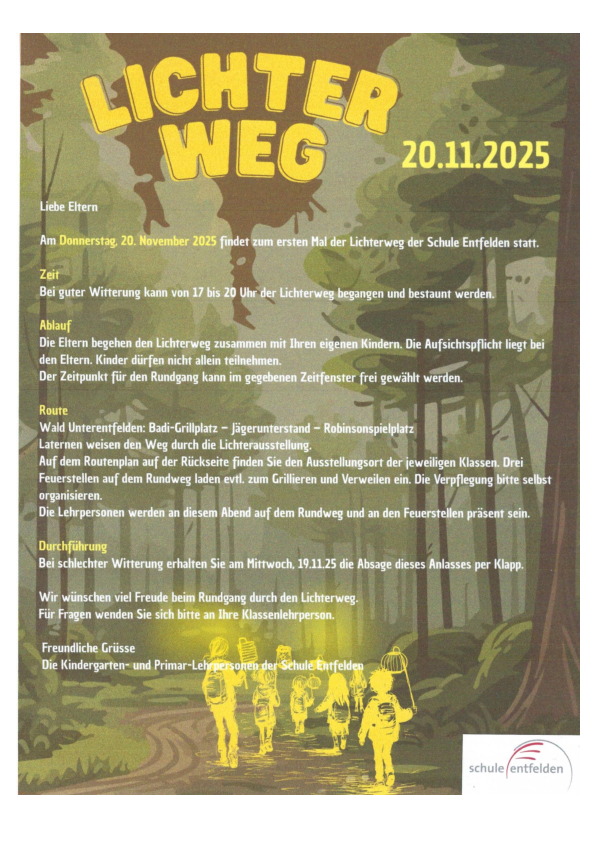 Am Donnerstag, 20. November 2025, findet der Lichterweg der Schule Entfelden statt.