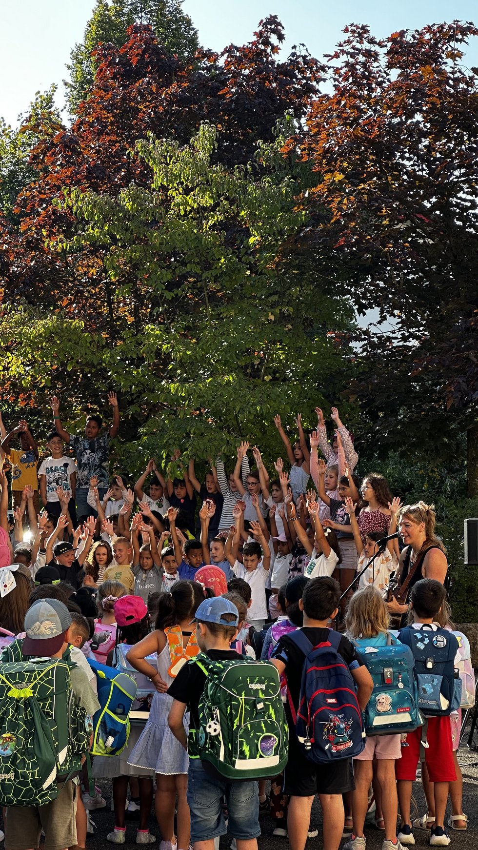 Am Morgen kamen die Eltern gemeinsam mit ihren Kindern auf den Pausenplatz, wo sie von den fröhlichen Stimmen unserer 3. Klässler:innen empfangen wurden. Mit ein paar fröhlichen Liedern hiessen diese unsere neuen Schulkinder herzlich willkommen. Auch unser Schulleiter richtete ein paar Worte an Kinder und Eltern und sprach damit wohl vielen aus dem Herzen. Die Aufregung ist gross, aber mindestens genauso gross ist die Vorfreude auf alles, was kommt. Anschliessend ging es für die neuen Erstklässler:innen gemeinsam mit ihrer Klassenlehrperson durch ein Spalier ins Schulhaus. Begleitet wurden sie von strahlenden Gesichtern und warmen Glückwünschen.